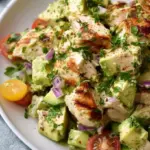 A refreshing and nutritious salad combining creamy avocado, tender chicken, and fresh vegetables, perfect for summer meals.