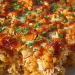 A comforting BBQ Ranch Chicken Casserole featuring layers of shredded chicken, zesty barbecue sauce, and creamy ranch dressing with a cheesy topping.