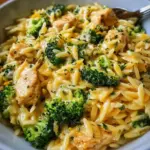 A creamy, cheesy dish featuring tender chicken, vibrant broccoli, and fluffy orzo pasta, perfect for cozy evenings.