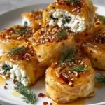 As you sink your teeth into these irresistible rolls, you experience a sublime contrast of textures—the satisfying crunch of crispy phyllo pastry envelops the smooth, velvety feta mixture, while the warmth lingers on your palate, inviting you to savor every morsel. Each bite delivers a symphony of flavors; the distinct saltiness of the feta harmonizes beautifully with the vibrant dill and mint, creating an explosion of freshness. The chili honey creates an experience beyond the ordinary, with the sweetness perfectly balancing the creamy richness, making these rolls suitable for any occasion. Whether served as an appetizer at a lively dinner party or enjoyed as a cozy snack with friends, these feta rolls promise to impress.